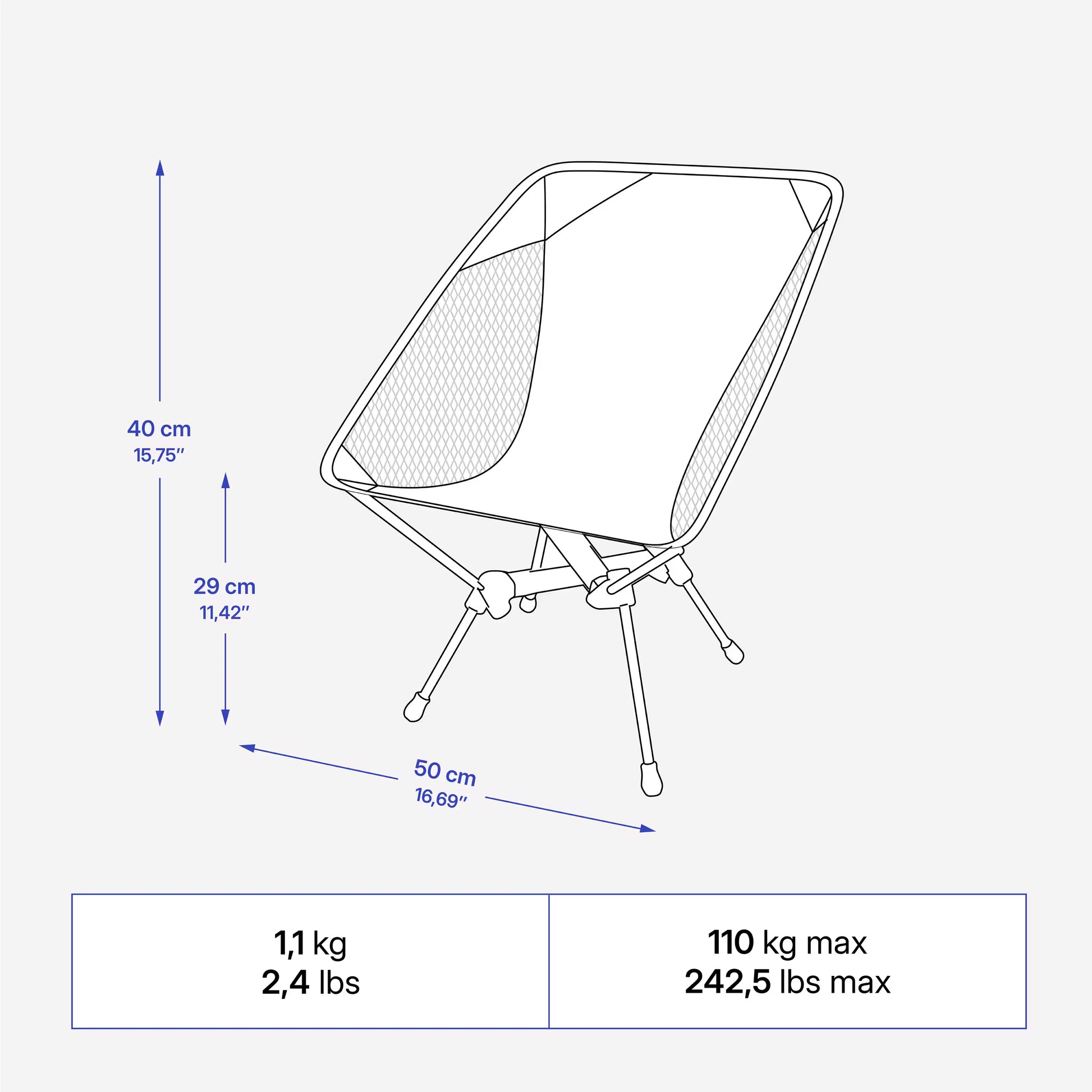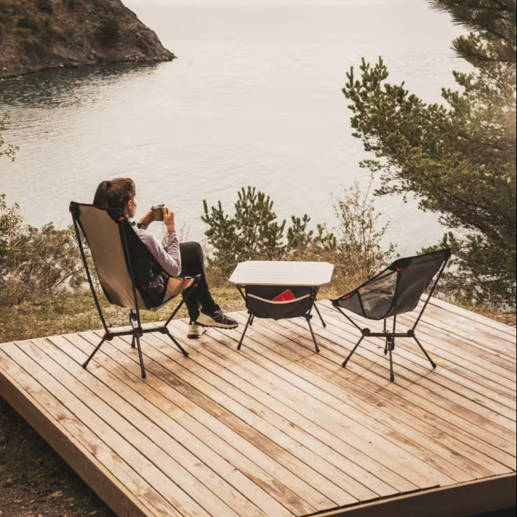 Discover our ultra-compact, lightweight camping chair. Ideal for a well-deserved break or meal at a low table after a good hike. Its ultra-lightweight aluminum structure fits easily into your boot.