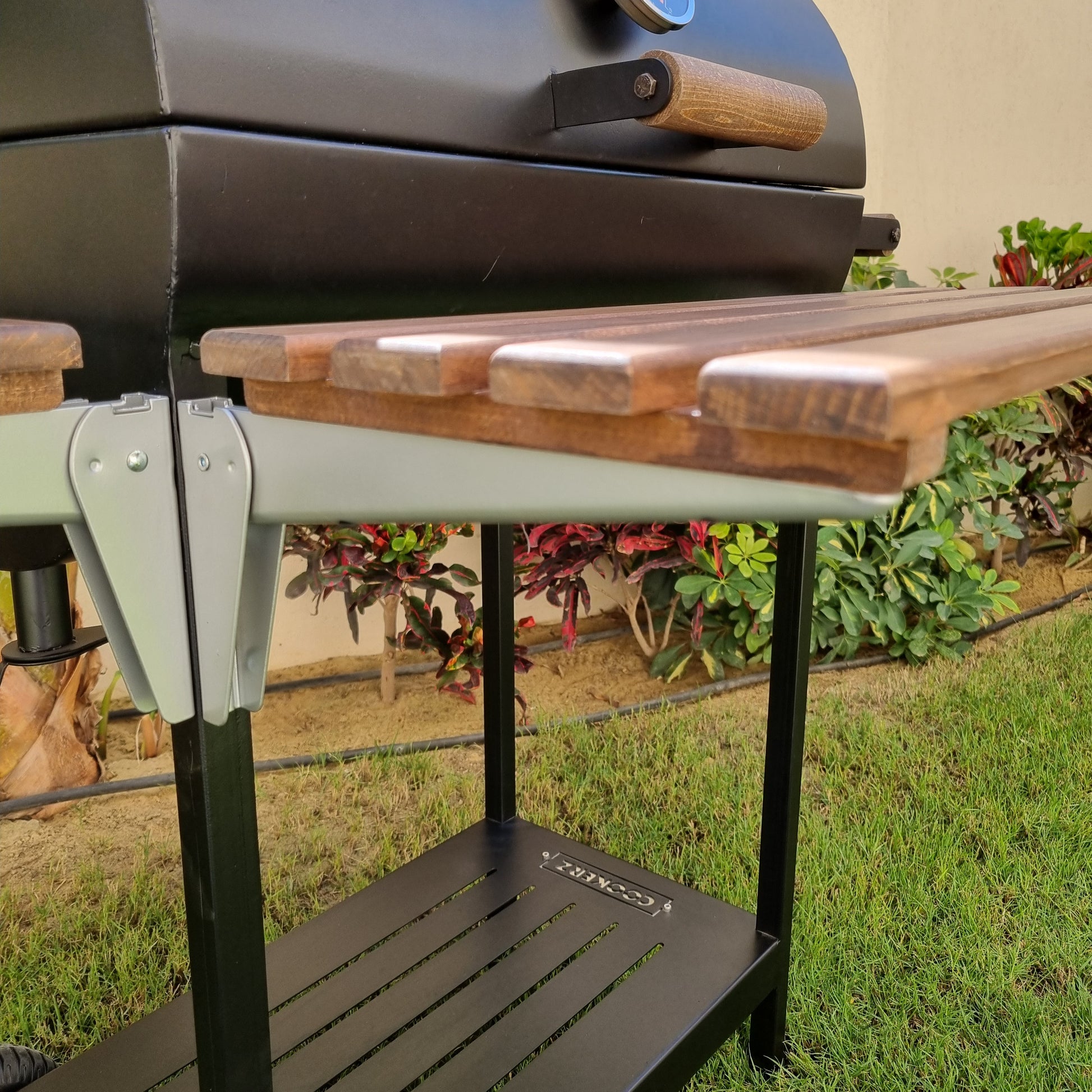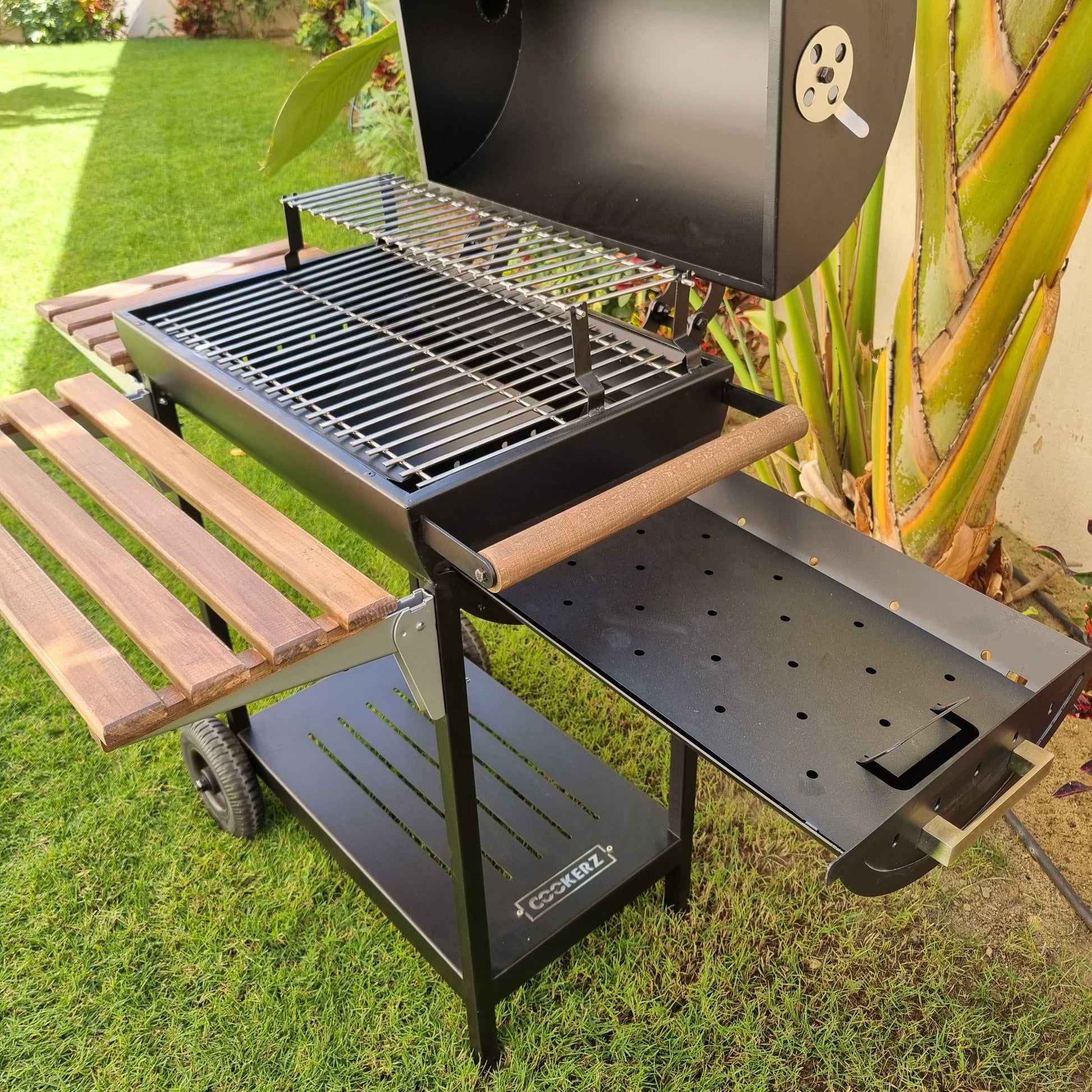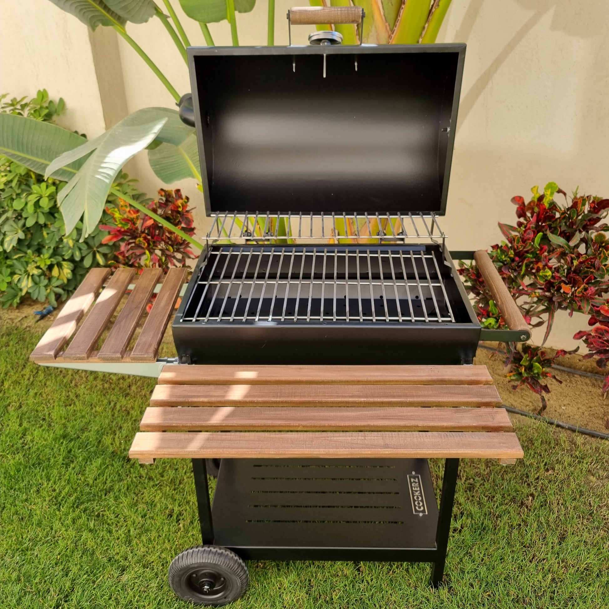 Classic Grill with charcoal drawer, 2 extendable side table & large wheels for easier transportation.