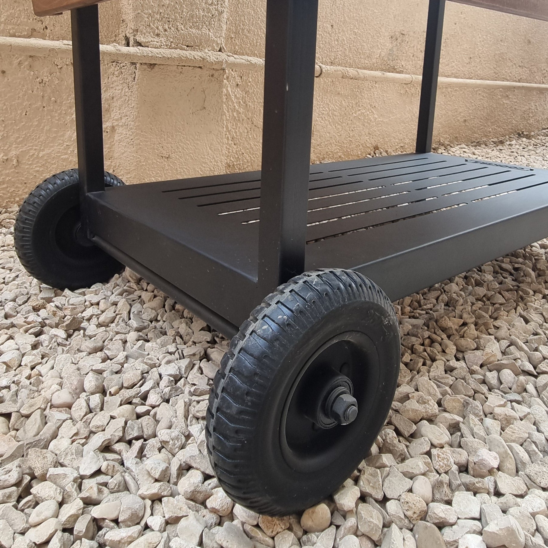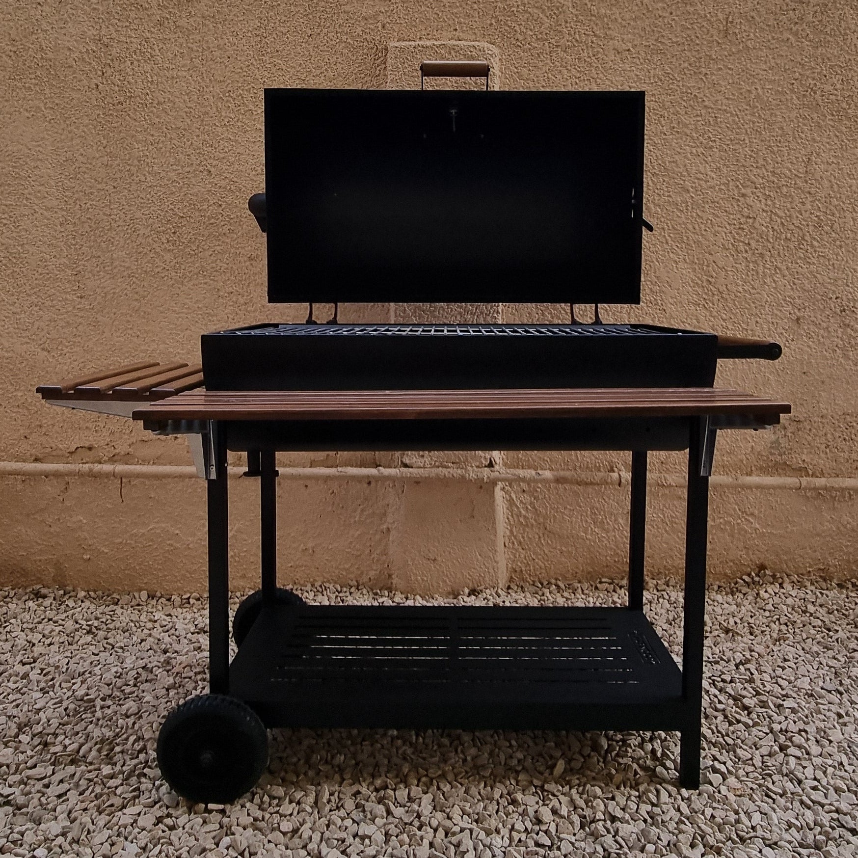 A Classic Grill with charcoal drawer, 2 extendable side table & large wheels for easier transportation.