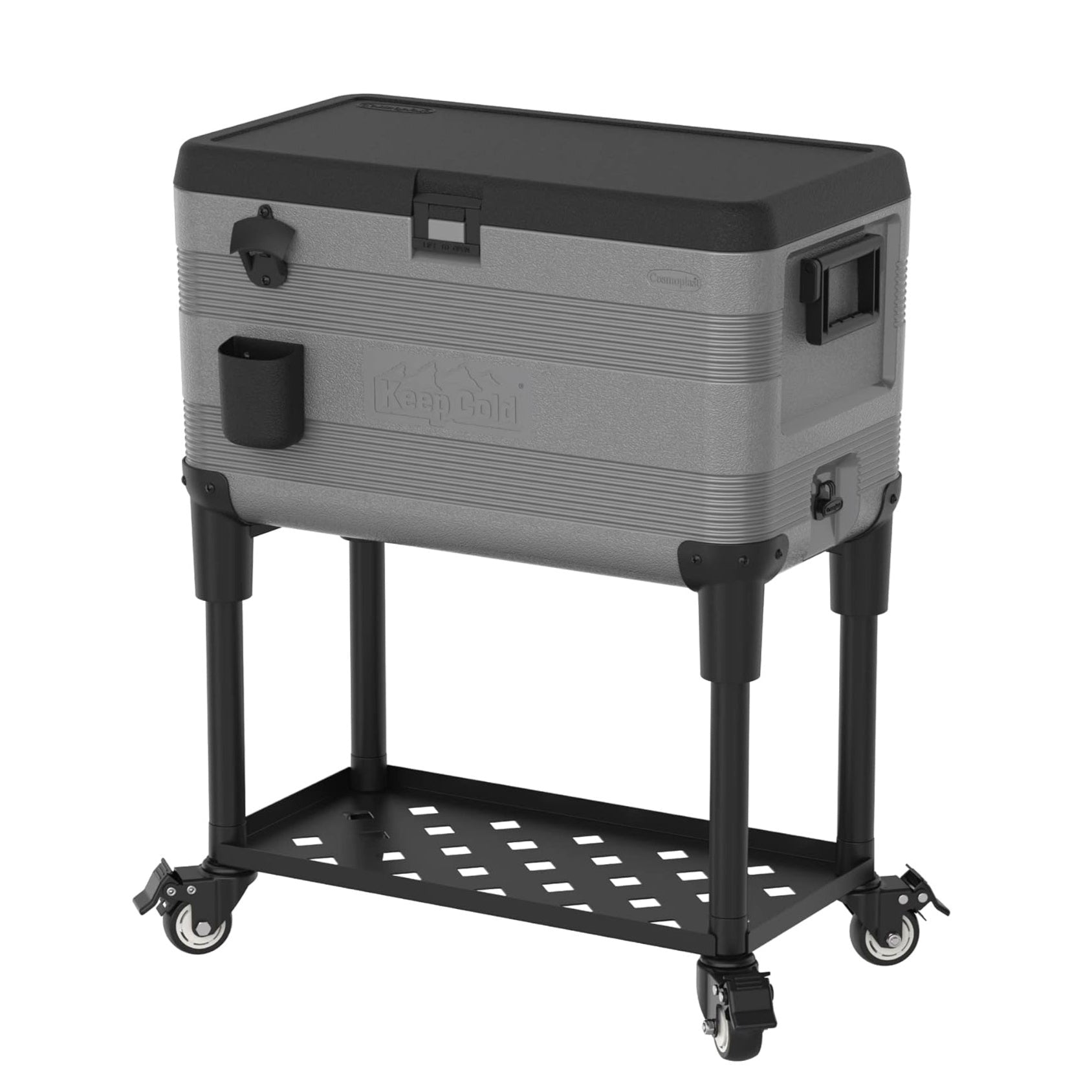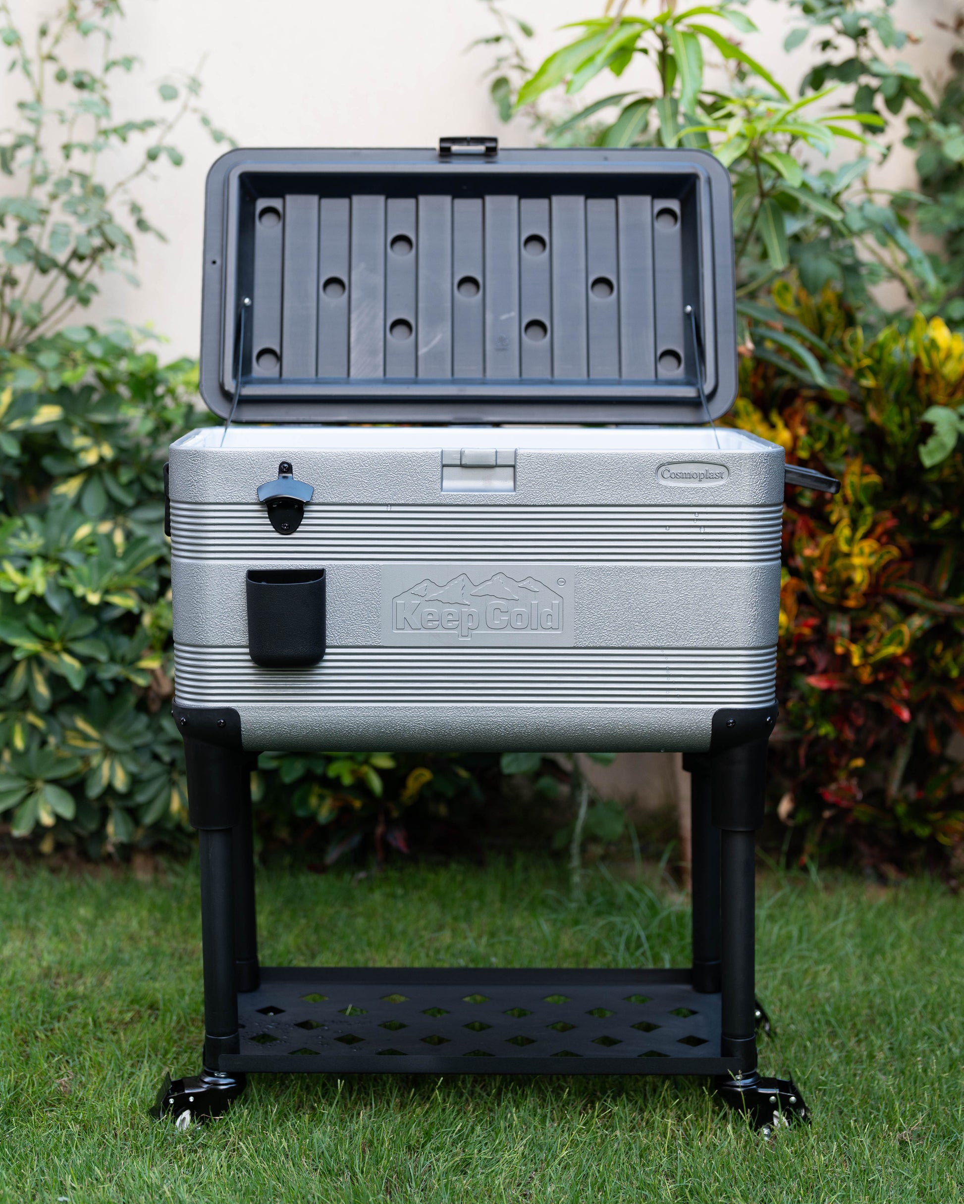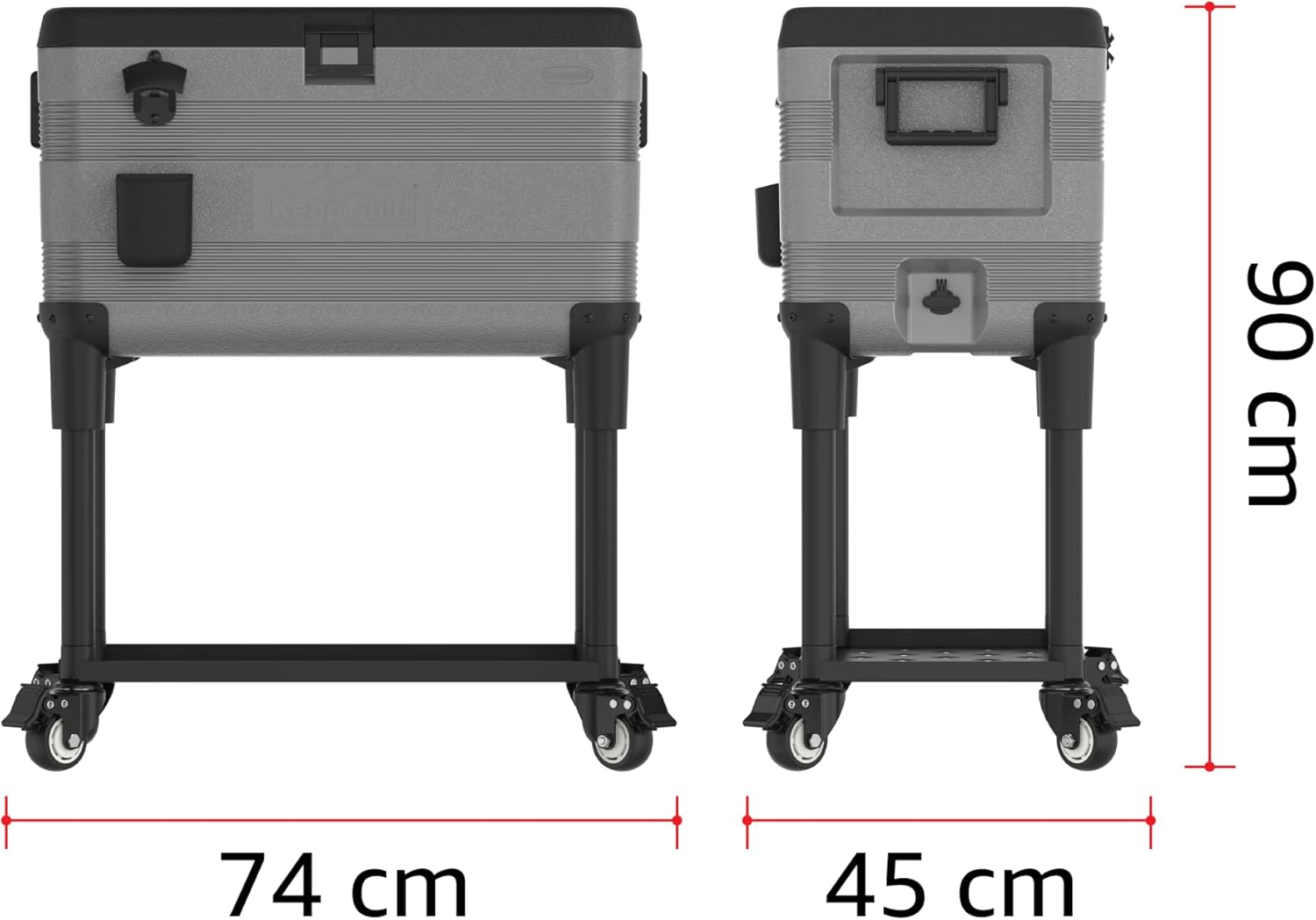 Introducing the KeepCold Patio Icebox Cart - the perfect addition to your outdoor gatherings! With 70 liters of storage and convenient wheels, it can be moved around with ease, keeping your drinks cold wherever you go. Plus, it comes equipped with a bottle opener for added convenience. Keep your drinks icy-cold and party-ready with the KeepCold Patio Icebox Cart!