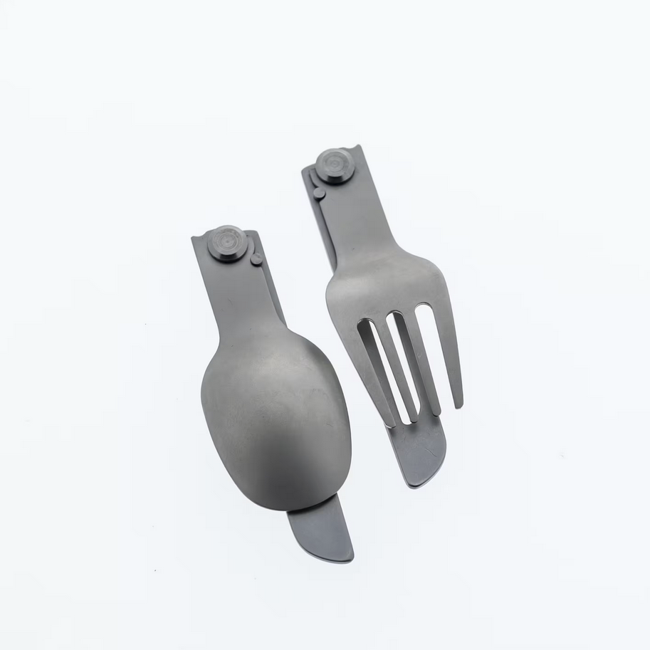 Discover our very strong stainless steel folding cutlery for one person. We designed them to fold so they both fit easily into their cover and your next adventure.