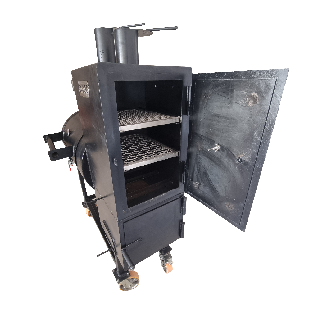 Reverse Flow System – Optimized heat and smoke circulation with a squared firebox and built-in warming cabinet.