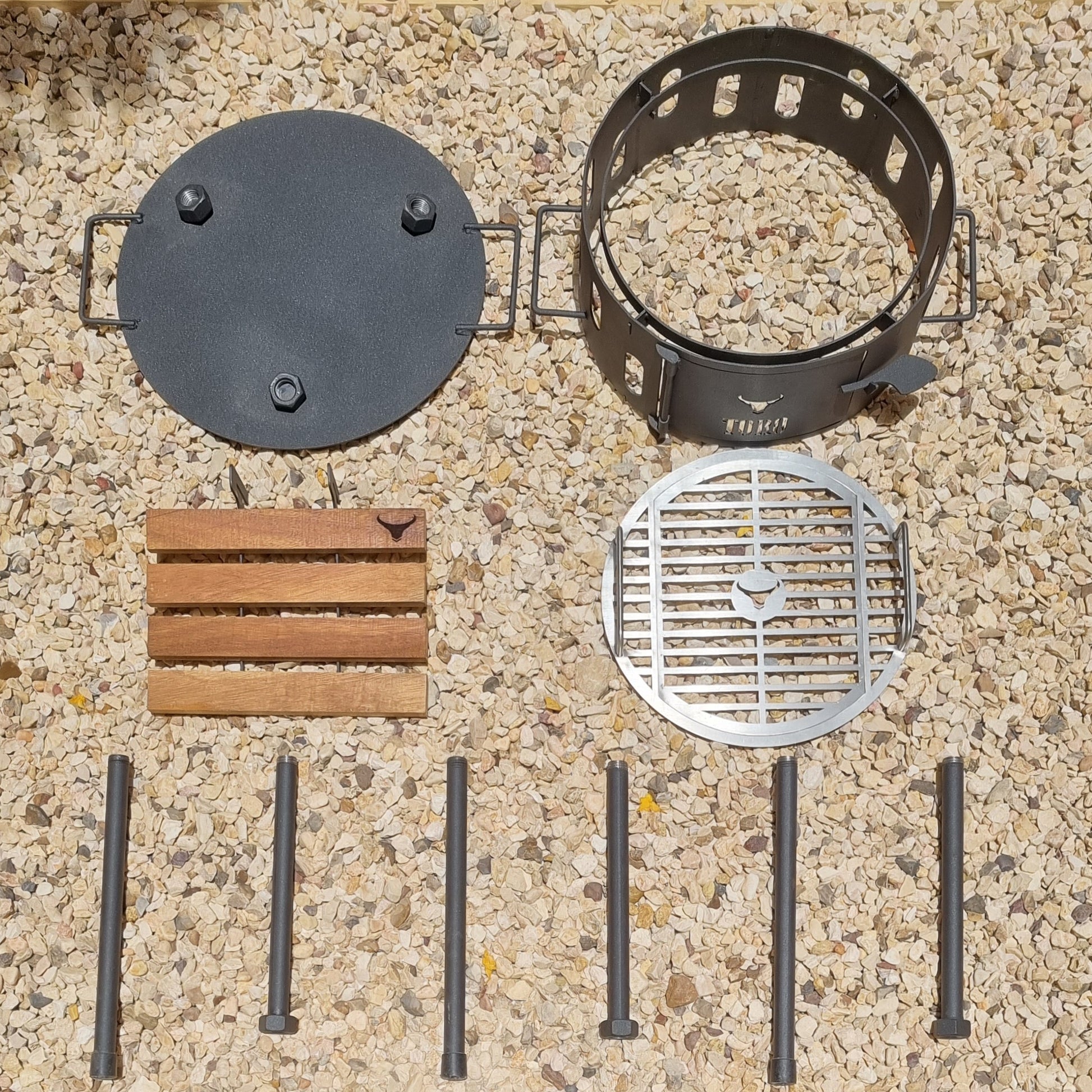 - Full Kit Package includes: (Grill, Stainless Steel grid, detachable side table, Stainless Steel Clamp Rack, Stainless Steel Griddle, Fire box, Fire tools set of 2)